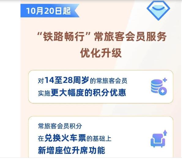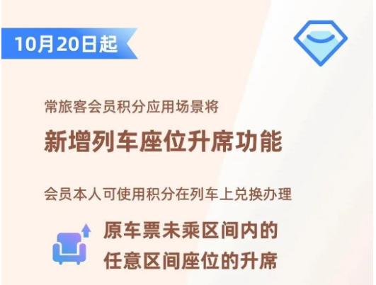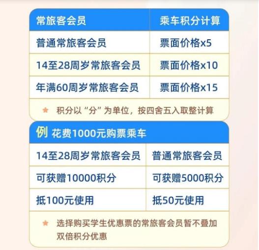 火车票可以“0元购”?很多人都坐过火车,但很多人不知道的是,坐火车还能领取积分,积分可以当钱花。 今天(20日)起,中国国家铁路集团有限公司将优化升级“铁路畅行”常旅客会员服务,对14至28周岁持居民身份证、港澳台居民居住证、港澳居民来往内地通行证、台湾居民来往大陆通行证、外国人永久居留身份证的常旅客会员实施更大幅度的积分优惠。 会员积分在兑换火车票的基础上,新增座位升席功能,常旅客会员积分的应用场景进一步拓展。 14至28周岁的常旅客会员 购票后获票面金额10倍的积分 目前,普通常旅客会员购票乘车后可获得票面金额5倍的积分,年满60周岁的老年常旅客会员可获得票面金额15倍的积分,为普通常旅客会员的三倍。 今天(20日)起,14至28周岁的常旅客会员购票乘车后将获得票面金额10倍的积分,为普通常旅客会员的两倍,即: 普通常旅客会员花费1000元购票乘车,可获赠5000积分、抵50元使用; 14至28周岁的常旅客会员花费1000元购票乘车可获赠10000积分、抵100元使用。 不过需要注意的是,选择购买学生优惠票的常旅客会员暂不叠加双倍积分优惠。 今天起,会员积分 新增列车座位升席功能 目前,常旅客会员积分可为本人或指定受让人兑换火车票,兑换火车票时100积分可抵1元使用,兑换的车票可办理1次改签并扣减部分积分作为改签费,不办理退票、变更到站业务。 今天(20日)起,常旅客会员积分应用场景将新增列车座位升席功能,会员本人可使用积分在列车上兑换办理原车票未乘区间内的任意区间座位的升席。 乘车途中,会员可扫描座椅扶手上的“铁路畅行”二维码登记升席需求,也可直接联系列车工作人员办理。 使用会员积分升席后的新车票不能办理退票、改签业务,因不可抗力或铁路责任造成升席车票不能使用时,可办理退票,升席车票未乘区间的积分将返回会员账户。 优化升级后的“铁路畅行”常旅客会员服务相关规则可通过铁路12306网站、客户端和12306客服热线查询。 |